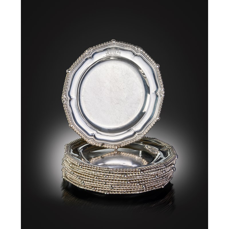 circular form, gadroon border, engraved with an armorial, diameter 25.8cm, approx. weight 255oz. (12)