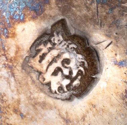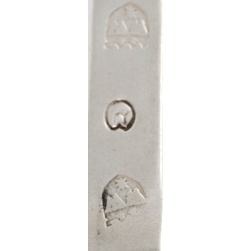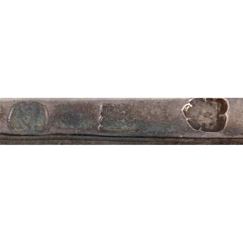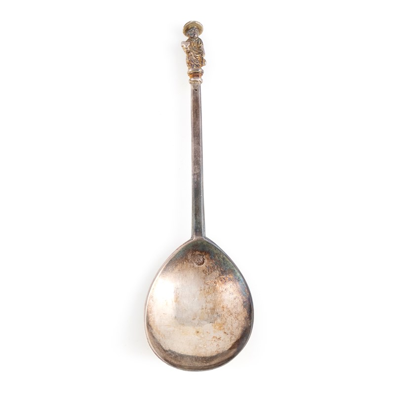 fig-shaped bowl, faceted tapering stem, gilded Apostle finial, with a holy dove nimbus, the reverse of the bowl prick-dot initialled 'B' over 'I.A', with an old collection label, length 18.4cm, total approx. weight 1.6oz.