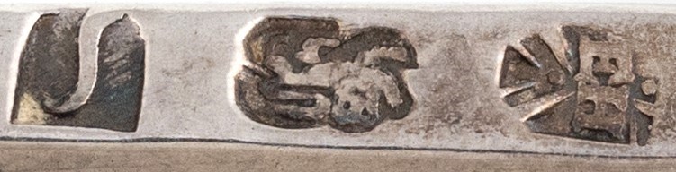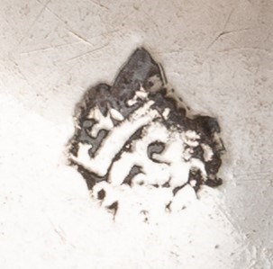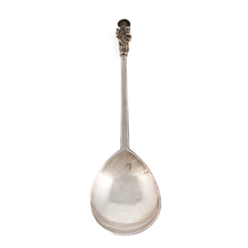 fig-shaped bowl, faceted tapering stem, gilded Apostle finial, with a holy dove nimbus, the reverse of the bowl prick-dot initialled '1641' over 'B' over 'E.G' with an old collection label, length 18.8cm, total approx. weight 2oz.