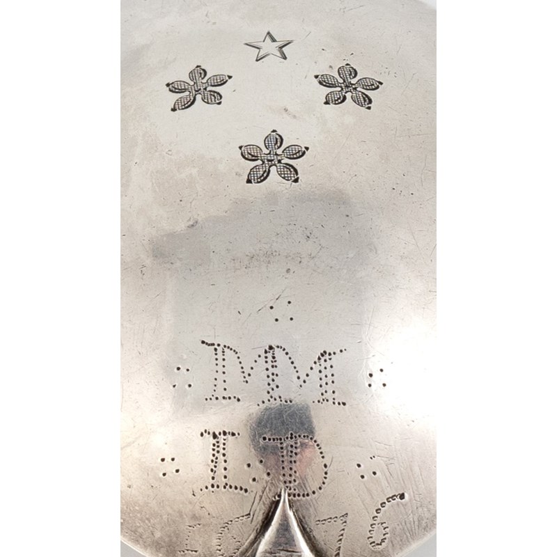 fig-shaped bowl, the reverse of the bowl with prick-dot initials 'MM' over 'ID' over '1676', faceted tapering stem, gilded finial with a plain nimbus, length 19.6cm, approx. weight 1.6oz.