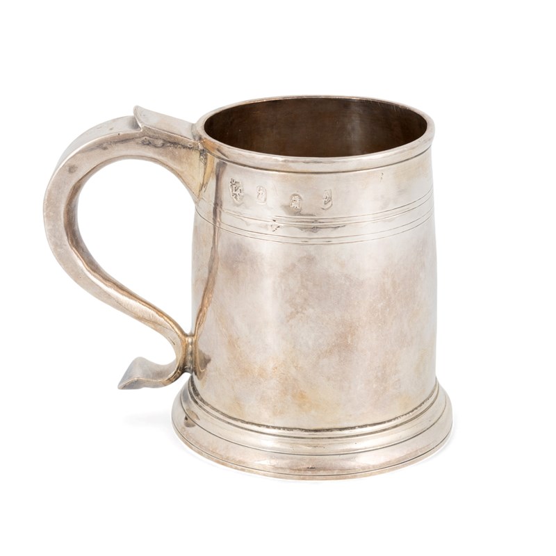 circular tapering form, prick-dot initials 'E.B', scroll handle, height 10.1cm, approx. weight 7.3oz.