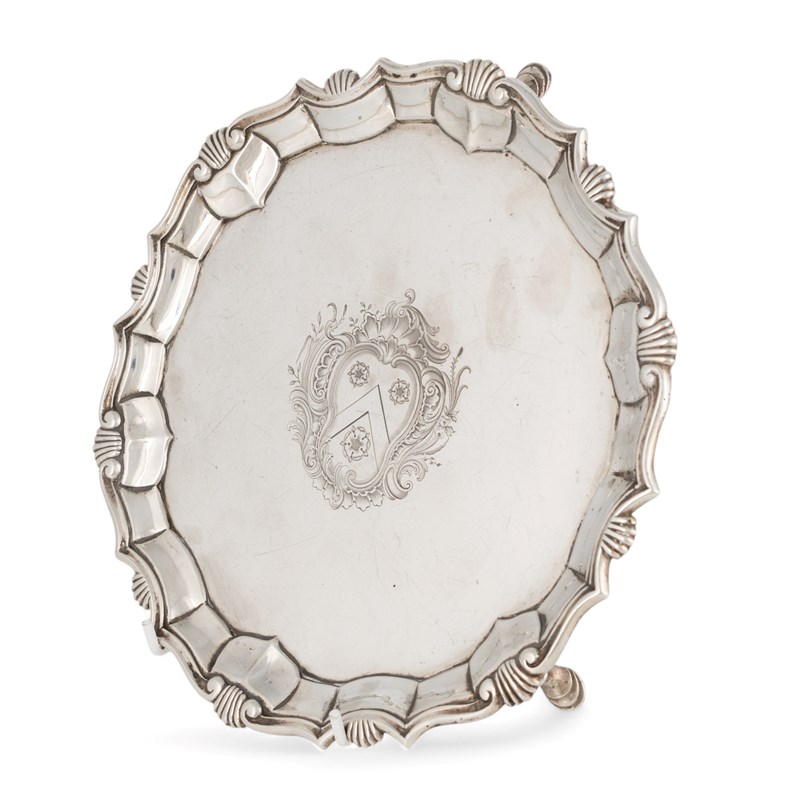 circular form with a moulded shell and scroll border, engraved with armorial inside scroll cartouche, on three hoof feet, diameter 22cm, approx. weight 14.3oz.