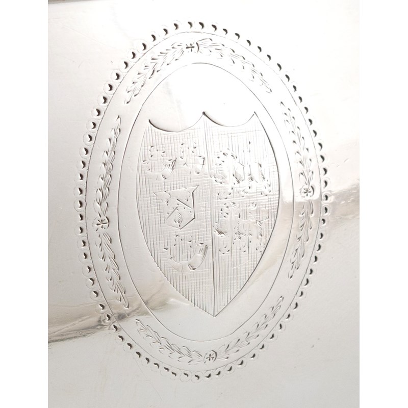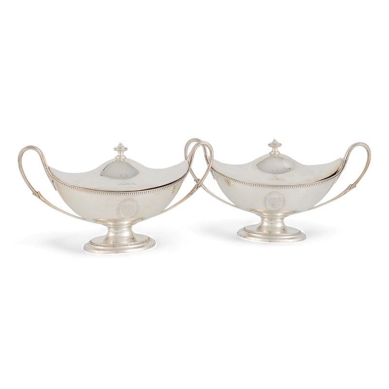 oval form with a beaded border, reeded scroll handles, pull-off covers with urn finials, with engraved crests to the covers and armorials to the bodies, on raised oval bases, length handle to handle 25.4cm, total approx. weight 45.2oz. (2)