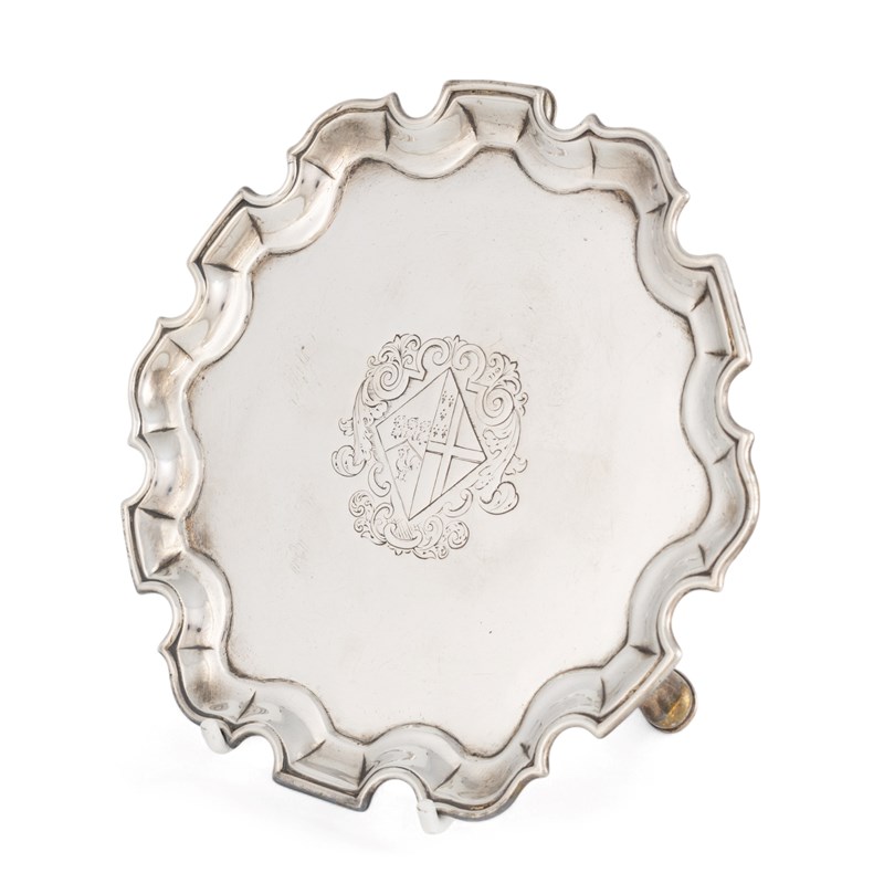 circular form, moulded border, the centre engraved with an armorial within a widow's lozenge, on three hoof feet, diameter 15cm, approx. weight 5.9oz.