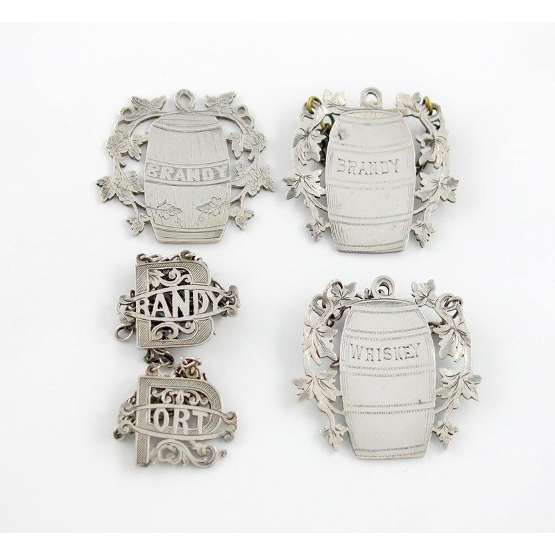 three modelled as barrels, incised 'BRANDY' (x2) and 'WHISKEY', plus two cut-out letter labels, for 'BRANDY' and 'PORT'. (5)