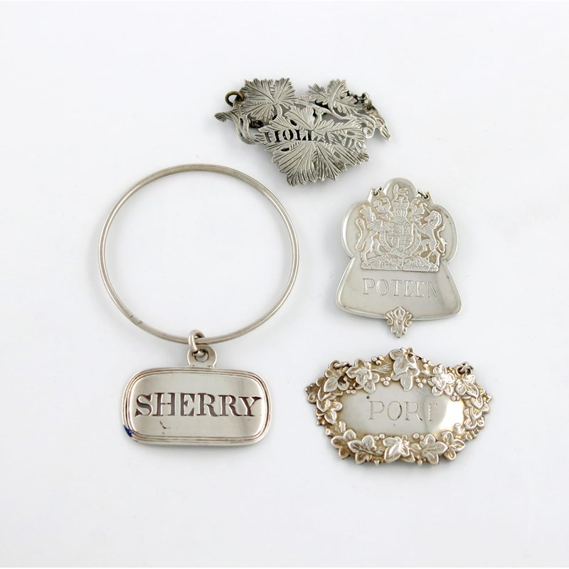 comprising: a modern label, by Roberts and Belk, London 1977, celebrating the Queen's Silver Jubilee, engraved 'POTEEN', plus one pierced 'SHERRY', repaired, one 'PORT' and one pierced 'HOLLANDS', approx. weight 2.5oz. (4)