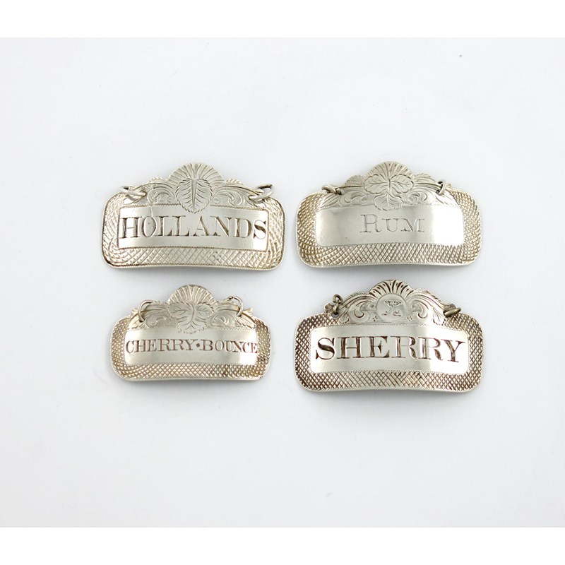 arched rectangular form, stylised and leaf border, incised 'CHERRY. BOUNCE', London 1816, plus 'RUM', 'HOLLANDS' and 'SHERRY', approx. weight 0.9oz. (4)