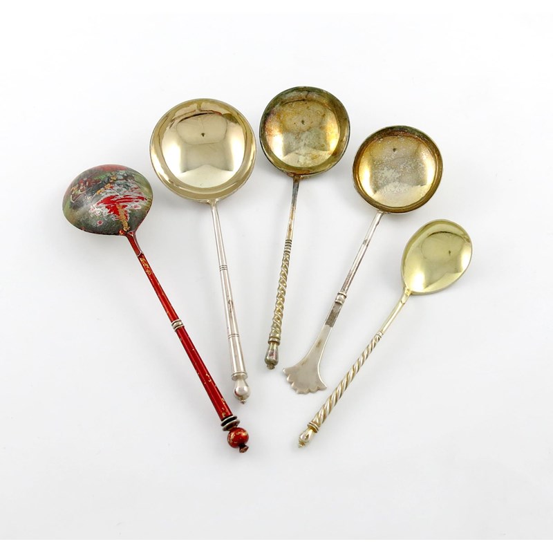 including: a spoon with red lacquer and a painted scene of a Troika, plus four with the reverse of the bowl with engraved decoration, gilded highlights, approx. weight 8.8oz. (5)