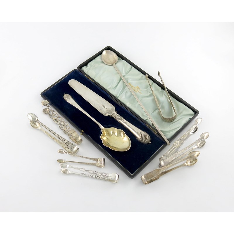 comprising an American cocktail spoon, by Cellini Craft, seven pairs of sugar tongs, and a cased serving spoon and slice, approx. weight 12oz. (qty)