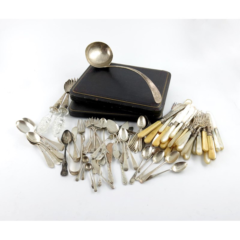 comprising: an Edwardian Old English pattern soup ladle, by Edwards and Sons, Sheffield 1901, a pair of salad servers with cut glass handles, a set of seven fruit knives and six fruit forks, a set of seven butter knives, another set of four fruit knives and forks, a cased set of ten teaspoons and tongs, a set of nine cased teaspoons, five oyster forks, seven butter knives, twenty-two teaspoons, two jam spoons, two pairs of sugar tongs, two christening spoons, a fork and other items including electroplate, approx. weighable 35oz. (qty)