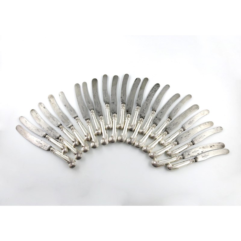 A set of twelve Victorian electroplated handled pistol-grip table and dessert knives,