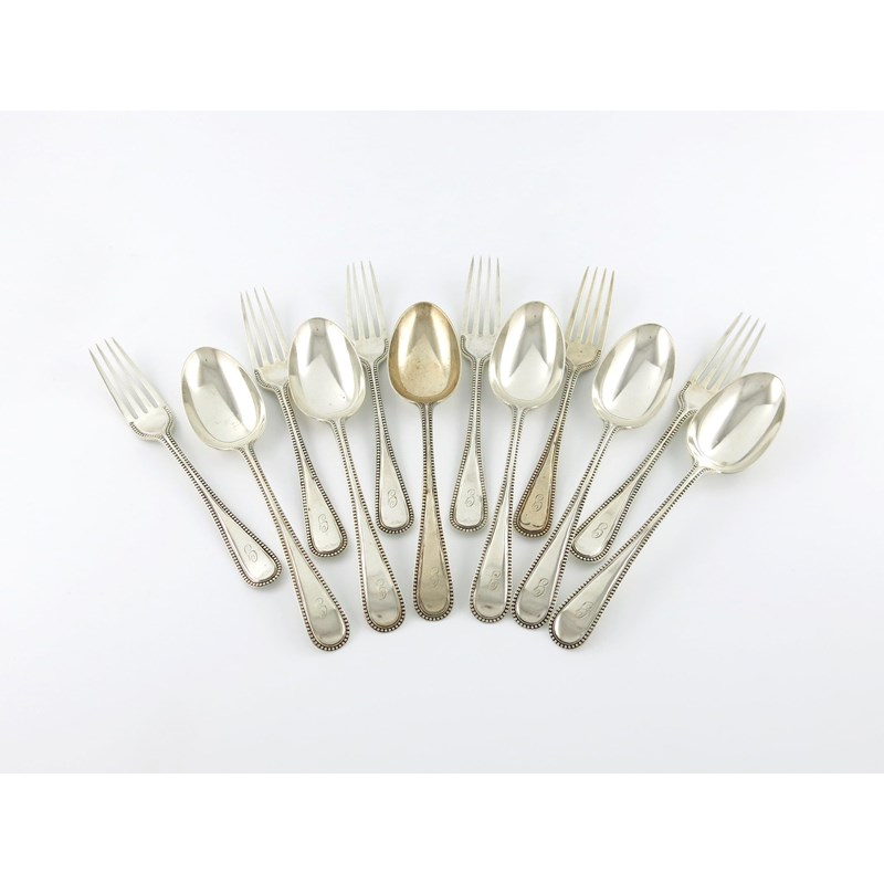 An Edwardian set of six Bead pattern table forks and six tablespoons