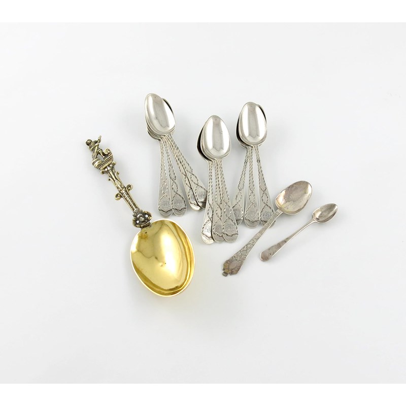 comprising a late 17th / early 18th century teaspoon, with engraved decoration, circa 1700, a set of ten George III Bright-cut teaspoons, by John Lambe, London circa 1780, a silver-gilt Dutch spoon and a miniature/snuff spoon, approx. weight 5.7oz. (13)