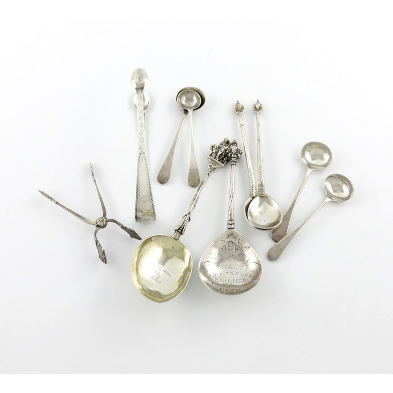 comprising: an 18th century Dutch spoon, with a figural terminal of Mary with Jesus, the reverse of the bowl initialled, the front of the bowl with a crest, a pair of sugar tongs, three continental spoons, four salt spoons and a pair of sugar tongs, approx. weight 7oz. (qty)