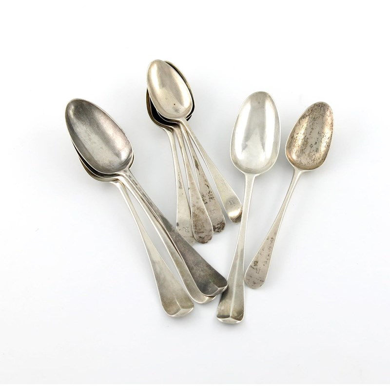 comprising: a set of five George III Old English pattern dessert spoons, London 1767, and four Hanoverian pattern tablespoons, approx. weight 12.5oz. (9)