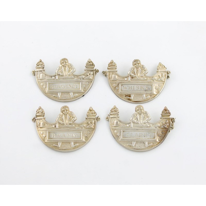 crescent form, modelled with a Victorian gentleman eating a fish, incised 'BURGUNDY', 'CLARET', 'BRANDY' and 'WHISKY', length 6.5cm, approx. weight 1.6oz. (4)