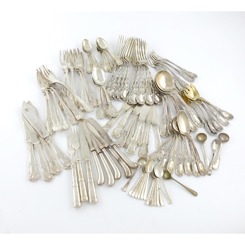 comprising silver items: ten table forks, five soup spoons, ten teaspoons, five oyster forks, five fruit spoons, five large teaspoons, five hors d'oeuvres forks, eight fish knives, twelve English coffee spoons, two forks and a knife, plus other items including electroplated fish eaters, approx. weighable 80oz. (qty)
