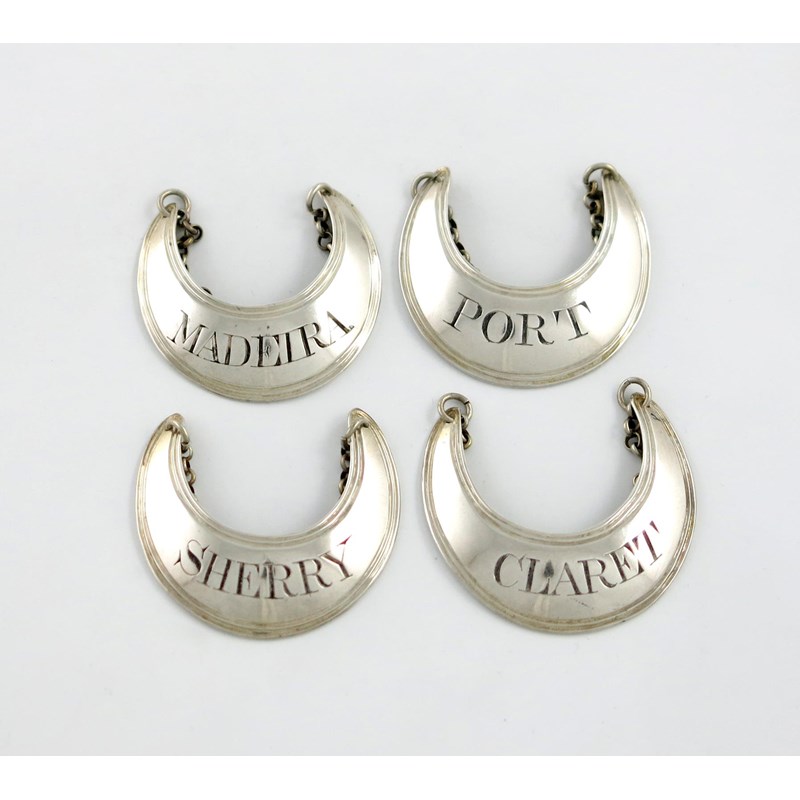 crescent form, thread border, incised 'MADEIRA', 'CLARET', 'PORT' and 'SHERRY', length 4.2cm, approx. weight 1oz. (4)