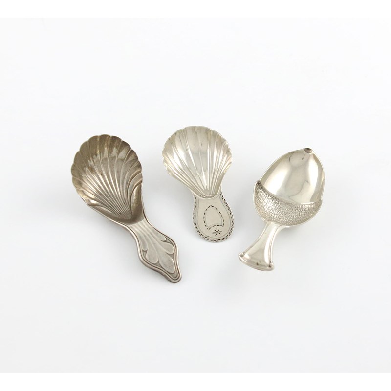 comprising: one by Richard Morton, Sheffield 1790, a bright-cut spoon by Richard Crossley, London 1787, plus one with an acorn shaped bowl, by Thomas Bradbury and Son, Sheffield 1912, approx. total weight 1oz. (3)