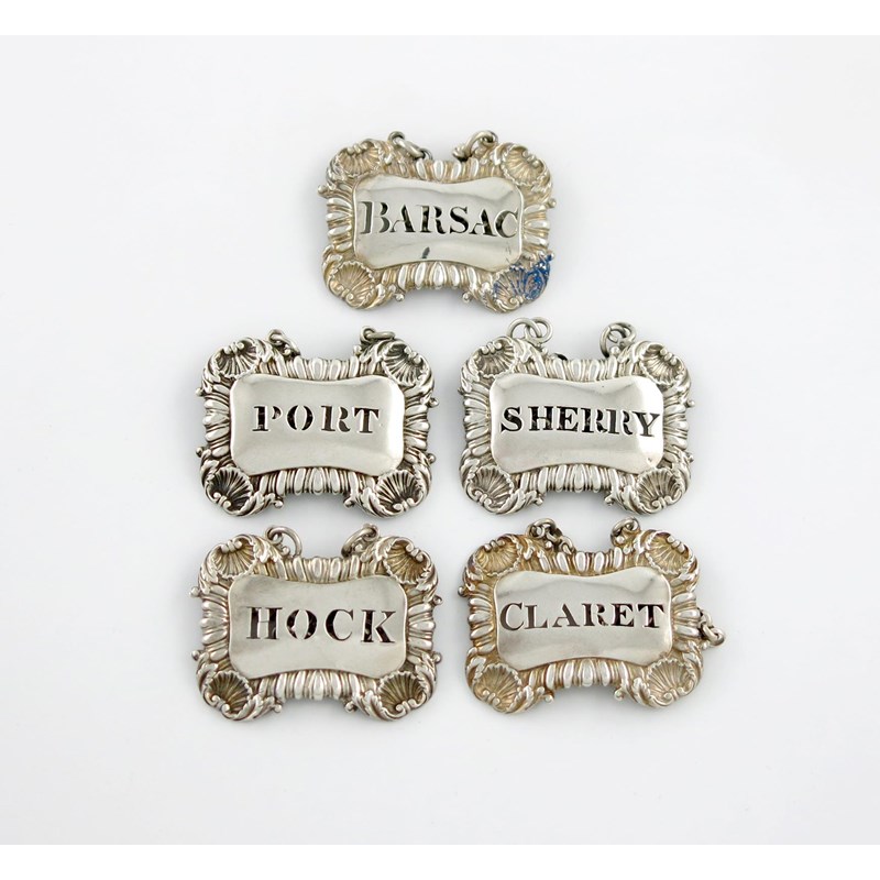 rectangular form, gadroon and shell border, pierced 'PORT', 'CLARET', 'HOCK', 'BARSAC' and 'SHERRY', length 4.7cm, approx. weight 3.2oz. (5)