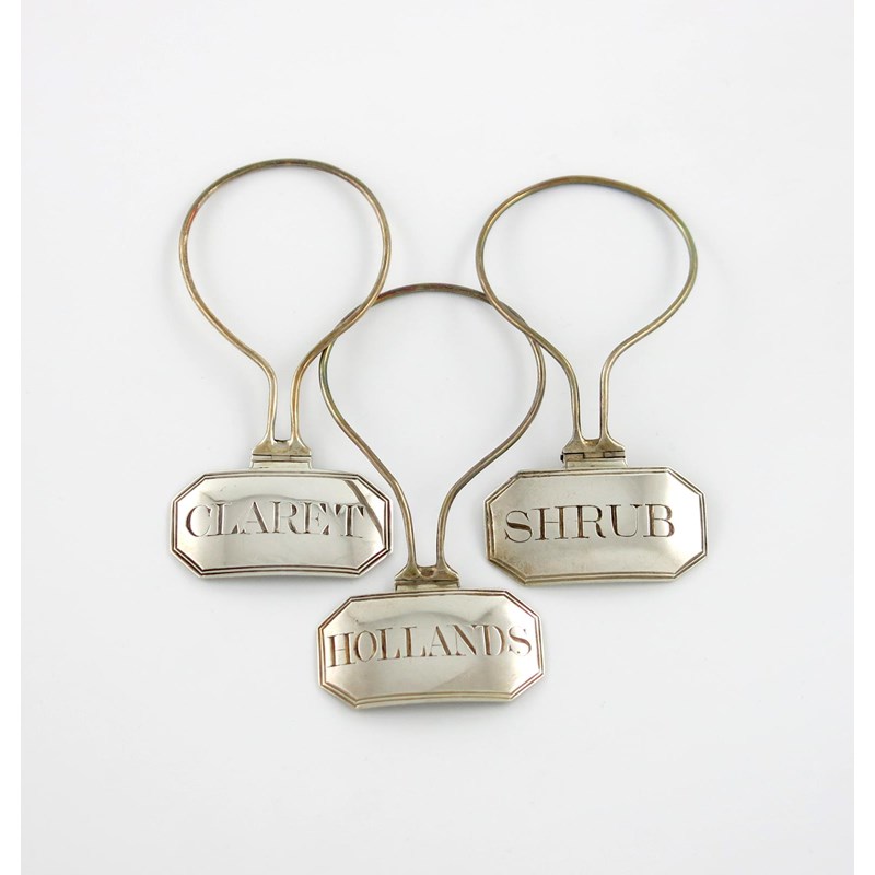 rectangular form, canted corners, reeded borders, hinged neck rings, incised 'CLARET', 'SHRUB' and 'HOLLANDS', length 4.8cm, approx. weight 1.4oz. (3)