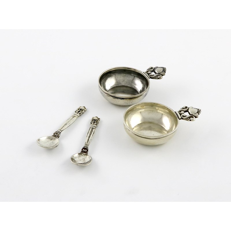 By Georg Jensen, a pair of silver Acorn pattern salt cellars and spoons,