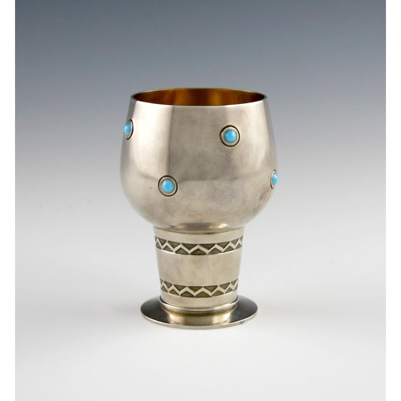 tapering circular form, set with turquoise enamel cabochons, on a circular stem on a circular foot, with zig-zag decoration, height 8.8cm, approx. weight 3.5oz.
