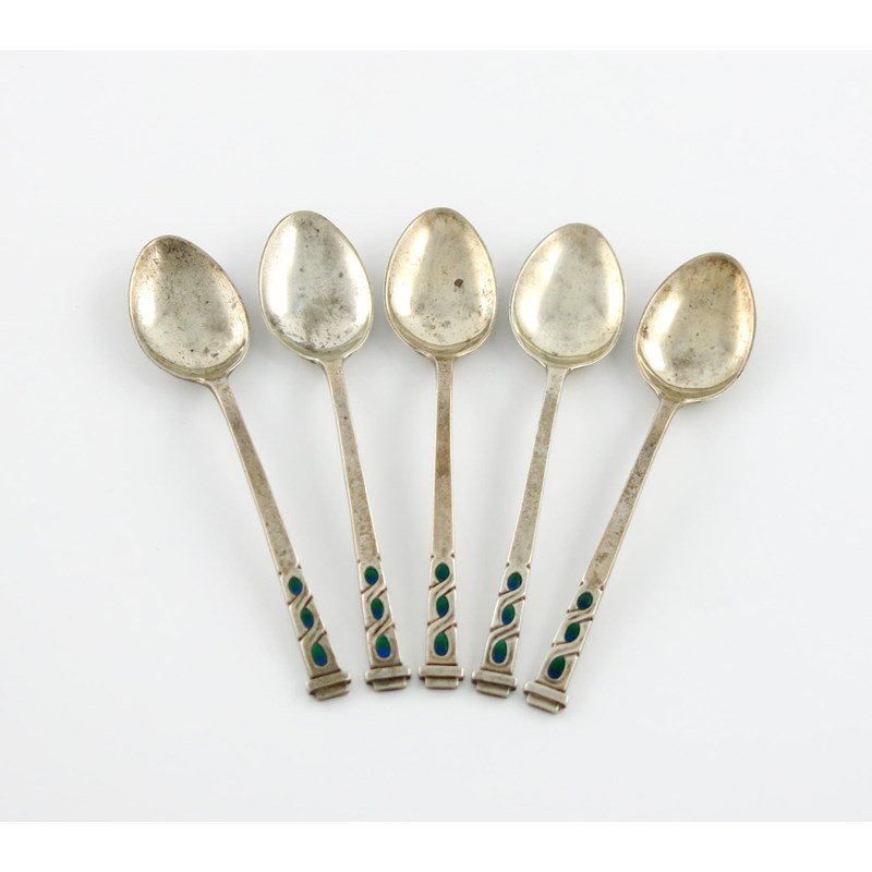By Liberty and Co, a set of five silver and enamel teaspoons,