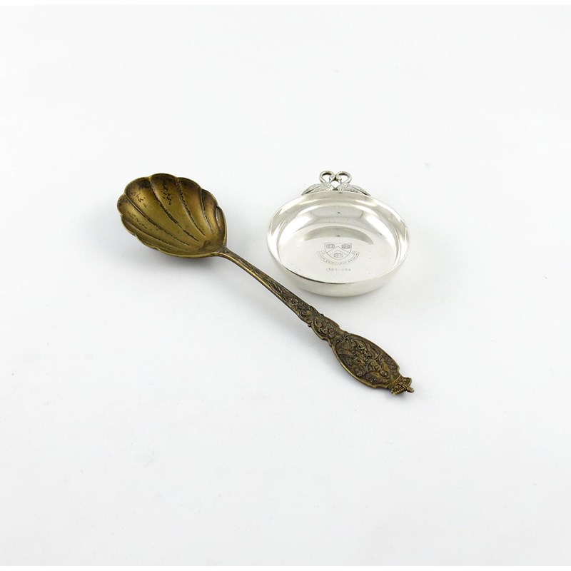 circular form, with a double swan handle, inscribed with the Arms of the Vintner's Company, and '1364-1964', diameter 8.5cm, plus a late-Victorian silver-gilt fruit serving spoon, the terminal with the arms of the Vintners Company, celebrating Victoria's Jubilee '1837-97', approx. weight 6.5oz. (2)