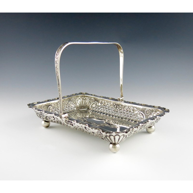 rectangular form, pierced and embossed foliate scroll and shell decoration, on four ball feet, length 27.5cm, approx. weight 24oz.