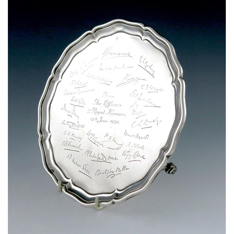 circular form, moulded border, the front inscribed 'From The Officers X Royal Hussars, 12th June 1928', and with facsimile signatures including 'Henry', for Prince Henry, Duke of Gloucester, son of George V, on three gnarl feet, diameter 24.5cm, approx. weight 18.5oz.