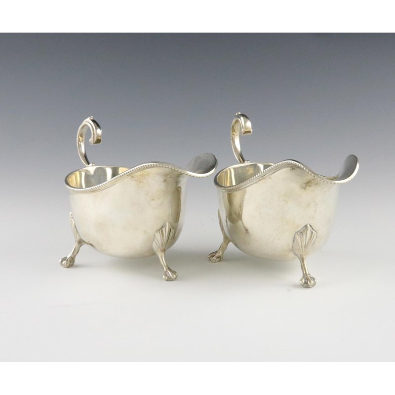 plain oval form, beaded borders, scroll handles, on three shell capped claw and ball feet, length 16.5cm, approx. weight 13oz. (2)