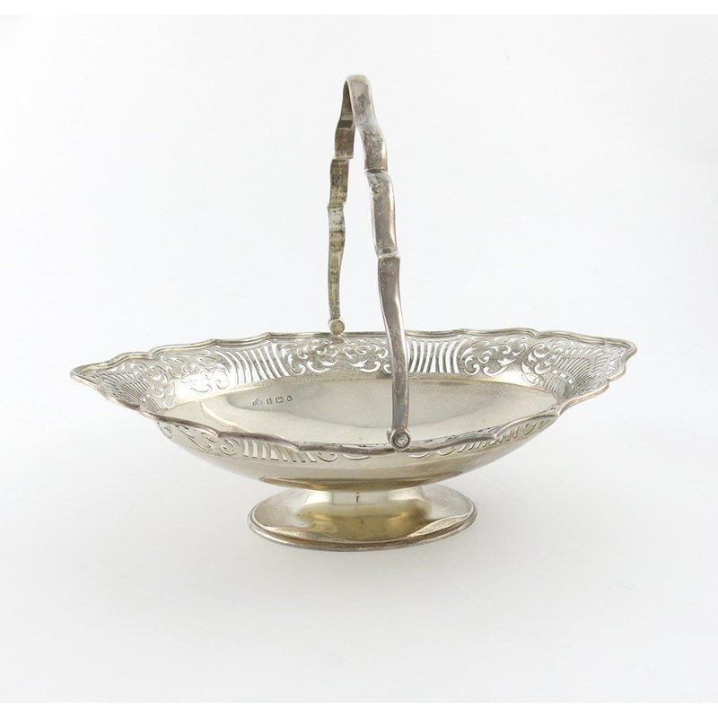 oval form, pierced foliate scroll decoration, on a raised oval foot, length 30.4cm, approx. weight 21oz.