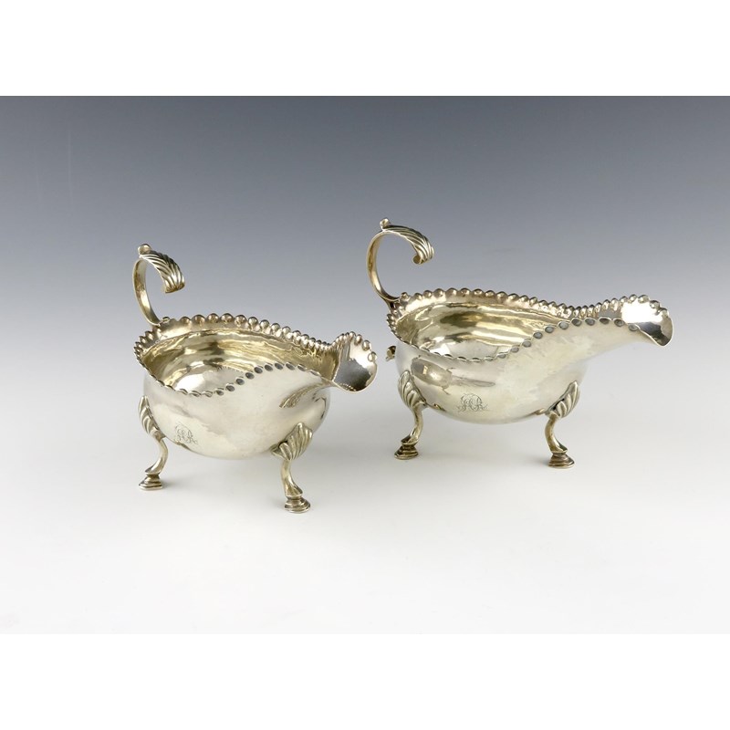 oval form, punch-bead borders, leaf-capped flying scroll handles, on three shell capped hoof feet, initialled, length 15.3cm, approx. weight 9.5oz. (2)