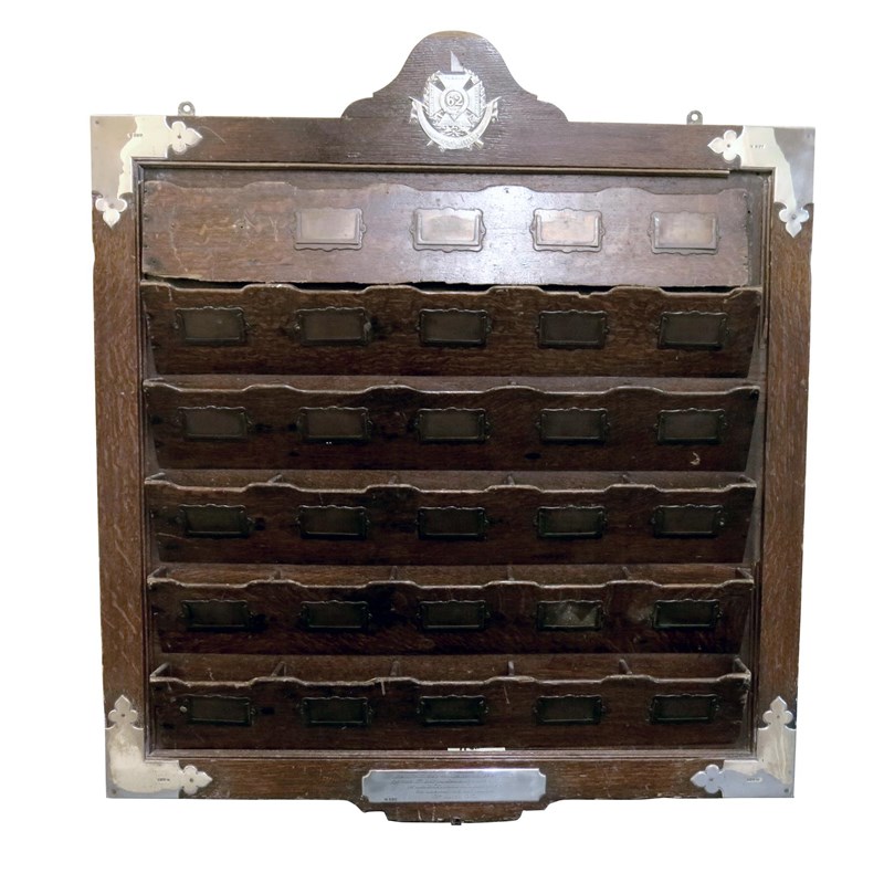 arched rectangular form, plain mounts, applied with the badge of The Wiltshire Regiment, and applied with a presentation plaque 'Presented to His Brother Officers of the 1st Battalion Wiltshire Regiment by Lieutenant Colonel A. G. Jeffreys on leaving the Battalion, 19th March 1910', a.f, height 104cm.