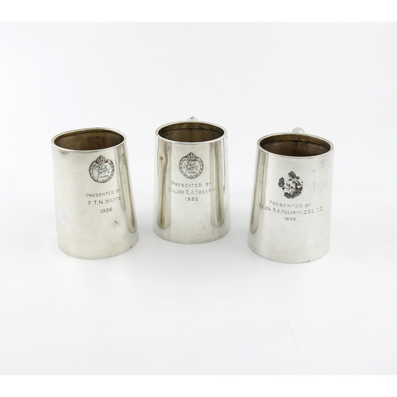 Three regimental silver mugs,