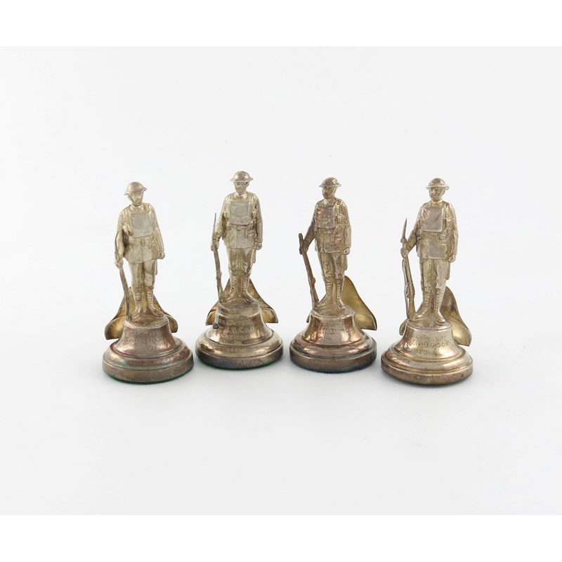 modelled as standing soldiers, on raised circular cases, inscribed, height 8.7cm. (4)