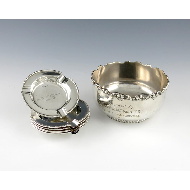 circular form, scroll border, with a presentation inscription, plus a set of six presentation ashtrays, by Walker and Hall, Sheffield 1932, approx. weight 20oz. (7)