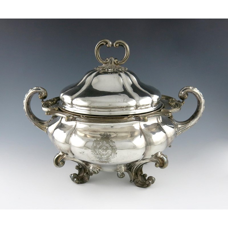 lobed circular form, leaf capped scroll handles, raised cover with a scroll handle, engraved with the badge of the 49th Hertfordshire Regiment, with a liner, on four scroll feet, length handle to handle 41cm.