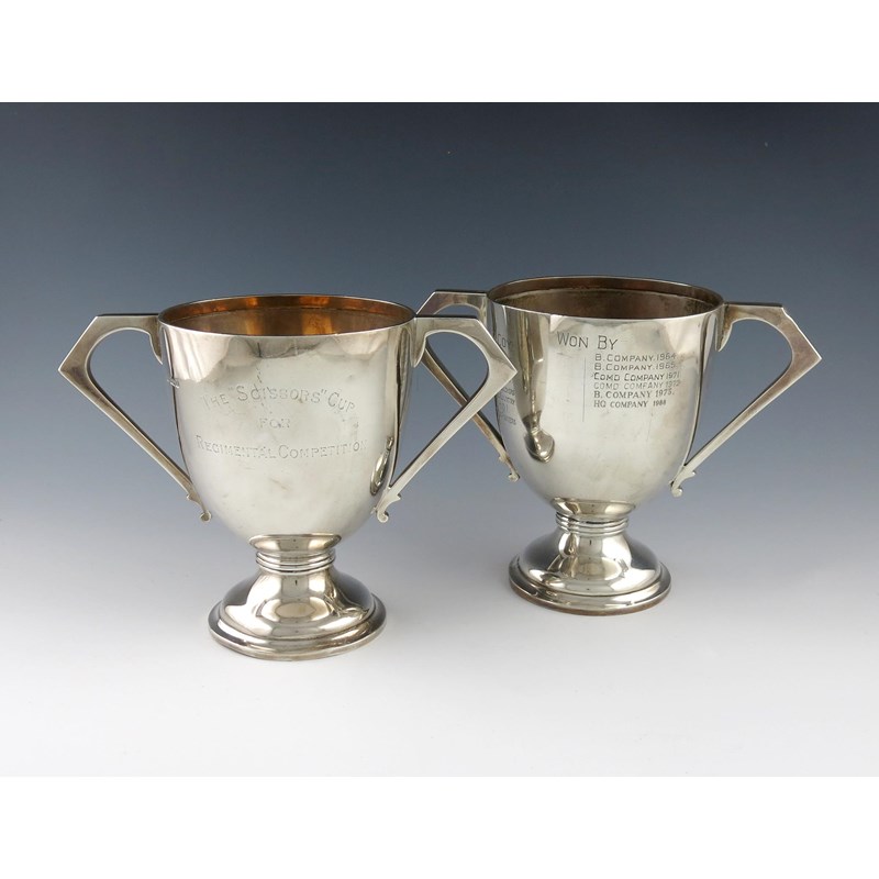circular form, angular scroll handles, on raised circular bases, inscribed 'THE SCISSORS CUP FOR REGIMENTAL COMPETITION', (one for swimming), also inscribed with the names of the winners, height 17.8cm, approx. weight 40oz. (2)