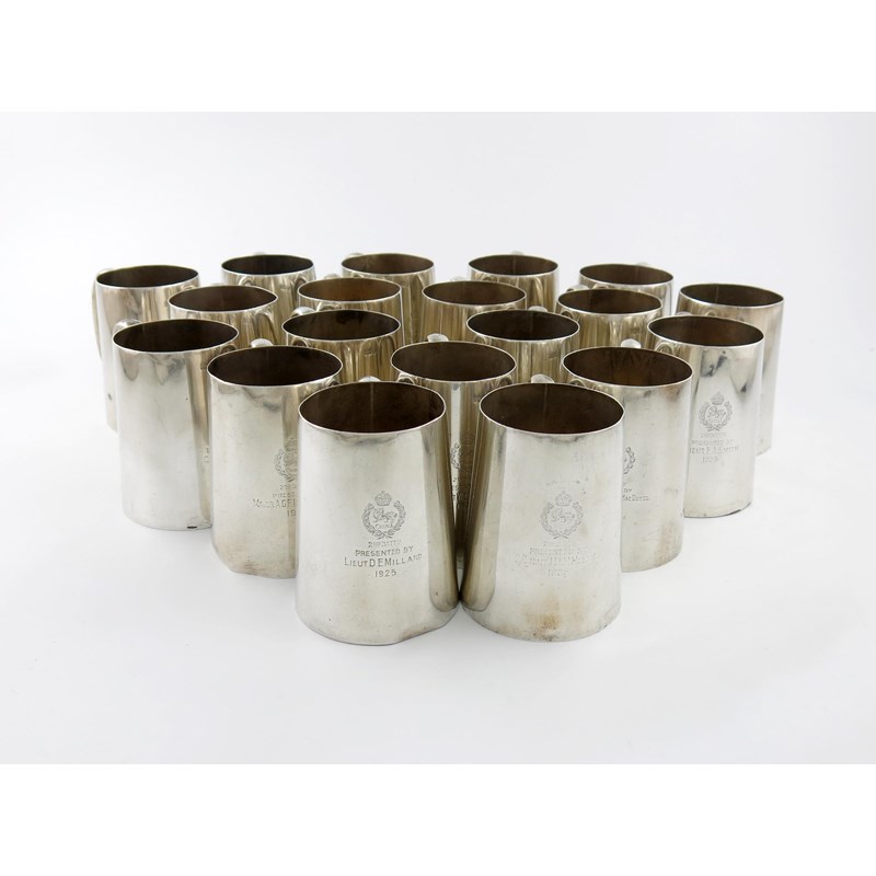 tapering circular form, scroll handles, engraved with the badge of the 2nd Battn. Royal Berkshire Regiment and the names of the presenting officers, glass bottoms, height 9.5cm, (19)
