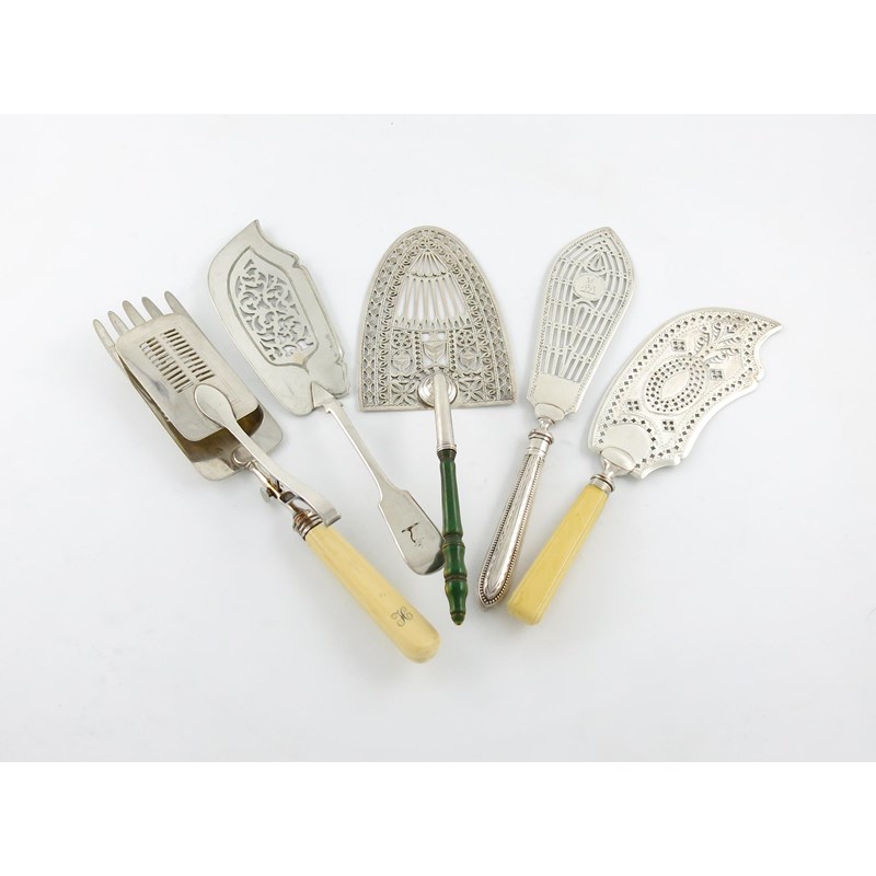 λA small collection of five old Sheffield plated and electroplated fish slices,