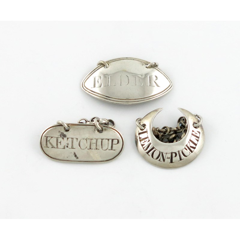 comprising: one by Peter and Ann Bateman, crescent form, incised and blackened 'LEMON PICKLE', plus one 'KETCHUP' and one 'ELDER', approx. weight 0.3oz. (3)