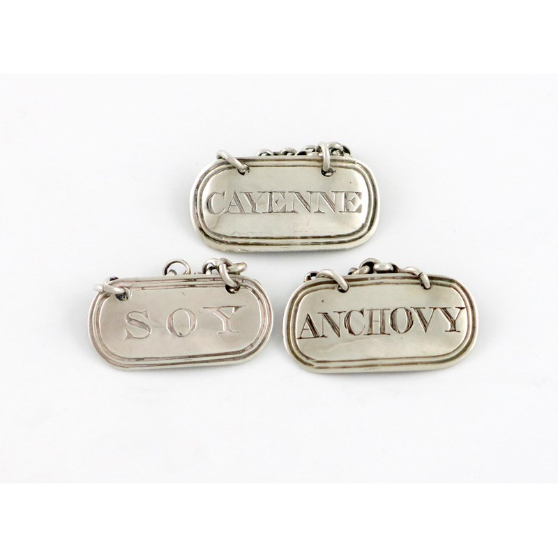 comprising: one by Mary and Charles Reily, incised 'CAYENNE', plus one 'ANCHOVY' and one 'SOY', approx. weight 0.3oz. (3)