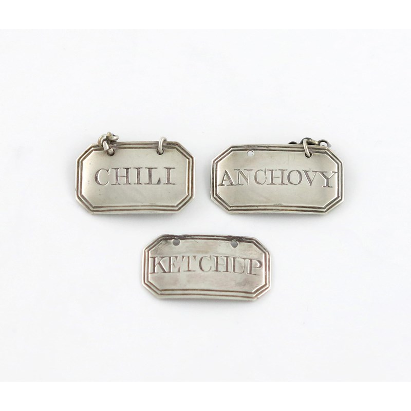 rectangular form, canted corners, reeded borders, incised 'KETCHUP', 'CHILI', and 'ANCHOVY', approx. weight 0.2oz. (3)