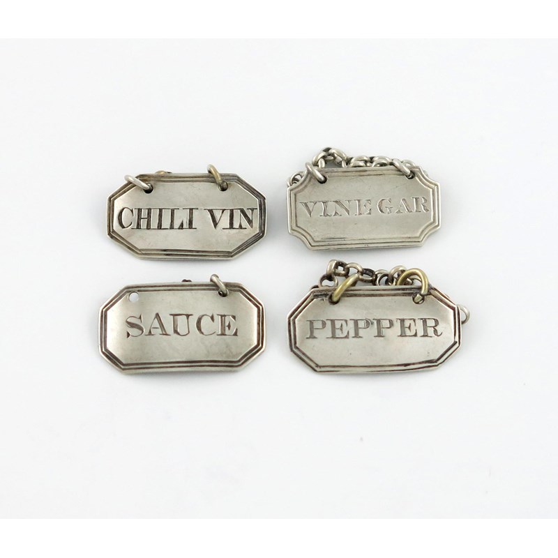 comprising: one by Elizabeth Morley, incised 'CHILI VIN', one 'SAUCE', one 'VINEGAR' and one 'PEPPER', approx. weight 0.4oz. (4)