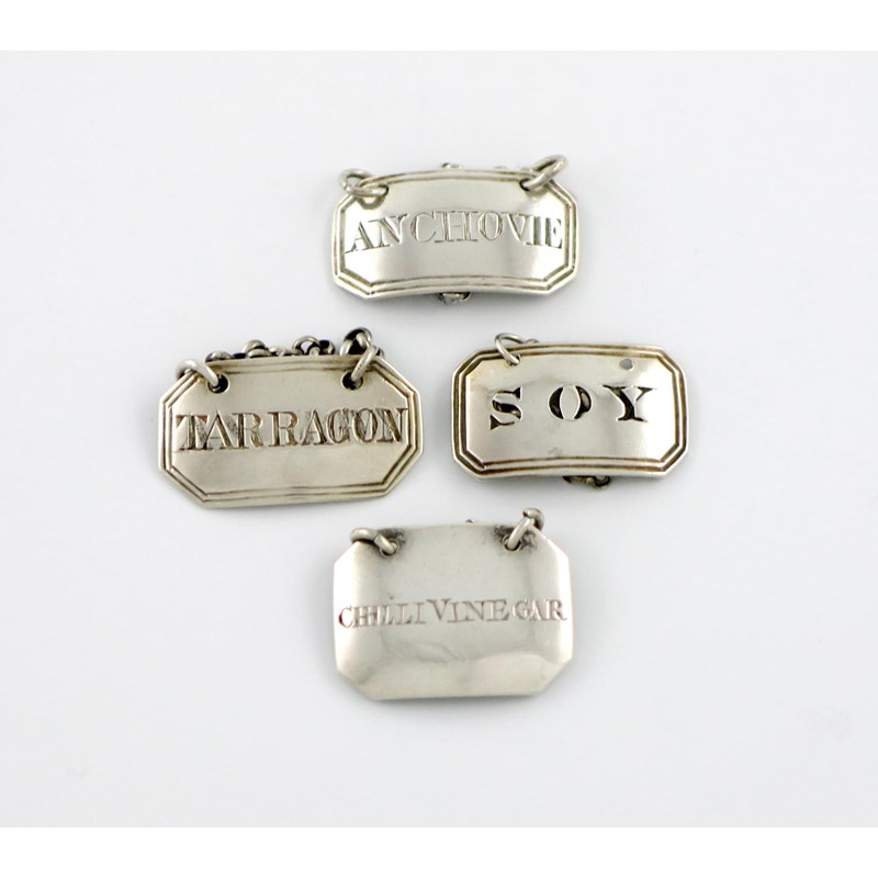 A collection of four antique silver sauce labels