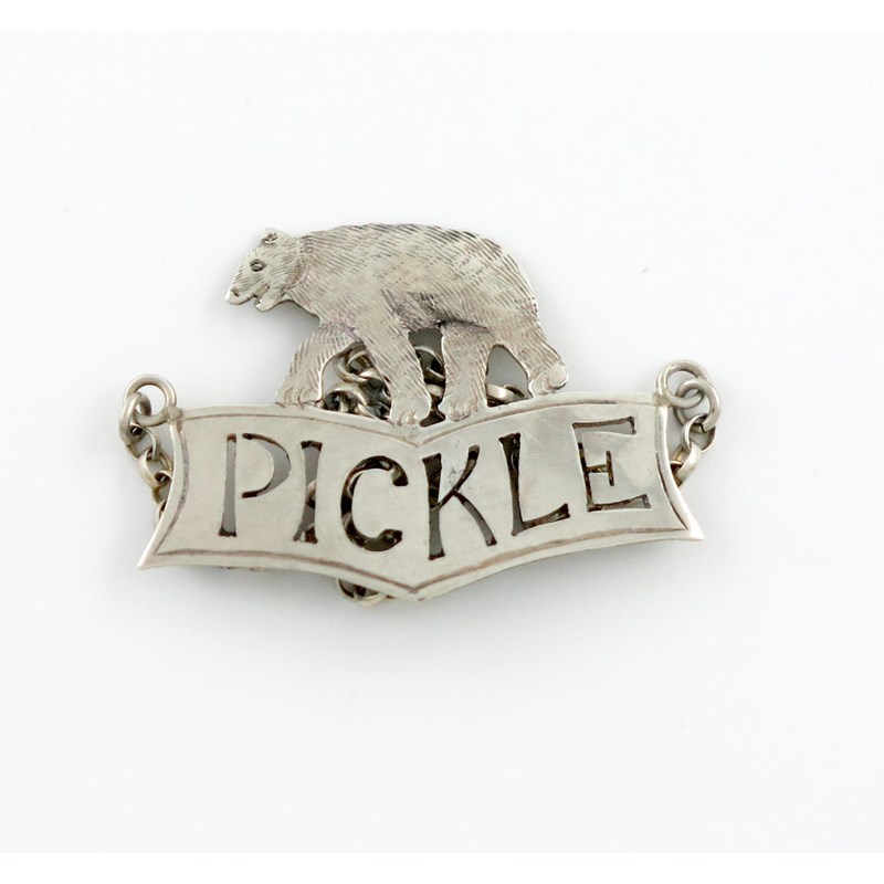 of banner form, mounted with a walking bear, pierced 'PICKLE', length 3.6cm, approx. weight 0.1oz.