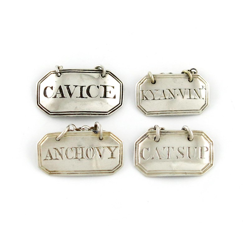 comprising: one titled 'CAVICE', London 1807, plus one 'ANCHOVY', one 'CATSUP', and 'KYAN. VIN', approx. weight 0.4oz. (4)