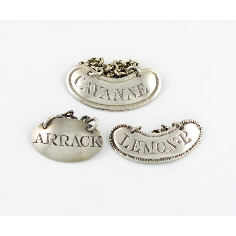 comprising: one by Thomas Hyde, Kidney form, incised 'LEMON P', plus one 'CAYENNE' and one of plain oval form, incised 'ARRACK', approx. weight 0.6oz. (3)
